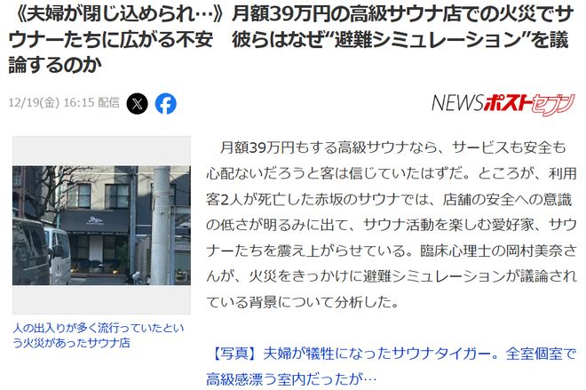 一对夫妇在东京的一家高档桑拿房内死亡。这不是柯南最新一集的情节,而是最近在日本发生的真实社会新闻。这起事件发生在12月15日,地点是东京赤坂一家名为“SAUNA TIGER”的会员制高端桑拿房。这家商店致力于“完全隐私”。所有房间均为完全独立的私人房间。口号是给予会员“成人的隐私空间”。价格区间也相当高,套餐价格从19,000日元到59,000日元(均不含税)不等,具体取决于客人数量和房间要求。还有60,000日元至390,000日元的月套餐。这是东京顶级豪华桑拿房之一。许多名人、运动员和网络名人都曾使用过它,被老顾客称为“港区有钱人去的地方”。此次事件中遇难的受害者是36岁的发廊老板松田雅也和他37岁的美甲师妻子松田洋子。两个人美容界知名网红。松田雅也是一位在小地方打拼的美发师,阳子来自她的家乡。他们有一个3岁的女儿。两人终于在东京取得了一些成绩,但厄运却降临到了他们身上。 15日中午,松田夫妇在这家店订了位。他们选择了2小时19000日元的套餐。 12时25分,救援人员来到店内,在桑拿房门口附近发现两人赤身裸体、不省人事,立即将两人送往医院,但两人也不幸身亡。随着侦查的深入,警方发现这起案件存在诸多诡异之处。首先就是这场火灾中的“火”。火源不是供暖设备本身。桑拿房整体并没有着火,火势也没有蔓延太多。取而代之的是,木制座椅和靠背上散布着几处烧焦的痕迹,大约有拳头大小。木材表面被烧焦烧焦了,变黑了,好像某处被烧焦了。此外,两名受害者的肩膀和背部还发现烧伤。而且这家桑拿店还有一个特色,就是客人可以带手机进入桑拿房。桑拿房是一个高温高湿的环境,而手机中的锂电池最怕高温。桑拿房的温度通常为40℃-60℃,高于锂电池工作温度0℃-35℃。长期暴露在高温下会缩短锂电池的寿命,甚至可能引起燃烧、起火、爆炸等严重现象。据警视厅称,事发时房间已上锁,消防队员使用备用钥匙打开了门。烟雾充满了房间,松田夫妇倒在桑拿房入口附近。虽然他们身上有烧伤和水泡,但并不致命。调查事后,他们发现案发房间的桑拿房门把手曾经掉进掉出。据店内工作人员介绍,事发包厢以休息区为中心,两侧设有桑拿房、浴室和冷水浴池。松田夫妇被发现时,正躺在桑拿房的出入口附近。调查人员还发现了一条燃烧的桑拿巾和一个直通前台的紧急按钮,按钮盖也被损坏。于是有人推测,事发时的情况很可能是这样的。当松田夫妇想要走出桑拿房时,发现门把手脱落,然后他们试图用裹着木炭的毛巾将门打破,或者用毛巾阻止房间继续升温。不幸的是,毛巾着火了,所以他们打破了紧急按钮并试图呼救。桑拿房的门上有标记疑似是松田夫妇被殴打后留下的。门是双层玻璃的,意味着他们可以看到门外的情况,只能眼睁睁地看着自己被困在桑拿房里。此外,替补人员还发现,这间桑拿房的“紧急按钮”只是一个装饰品。一般的桑拿店都应该有紧急报警装置。一旦按下,刺耳的警报就会响起,店内的主控制面板也会显示事故发生在哪个房间。即使不按任何按钮,当桑拿房出现异常情况,比如温度异常升高时,警报也会响起。但当时桑拿房内主控板电源疑似被切断,并没有报警。事后,老板向警方供述,并非电源被切断,而是桑拿房的紧急按钮没有与主控板连接,并且主控板从来没有打开过。更不寻常的是,正常情况下店里应该有三名工作人员,但事发时却没有人在工作。目前,警视厅正在对这起涉嫌职业过失死亡事件进行进一步调查。对此,日本网友表示,这家桑拿店如何通过安全检查是一个大问题。 “我觉得这不是几个因素的巧合。相反,我觉得之前没有发生过事故是巧合。我听说像这样的桑拿房不强制要求安装紧急按钮,这种按钮已经在酒店行业注册了。但我很困惑。他们只是安装按钮然后关闭电源吗?我感觉起火的是酒店。以前。”有报道称,该店老板称“这个设备从未开启过”。在这种情况下,员工和兼职工人应该认为随时关闭设备是正常的。他们甚至不知道这些装备是做什么用的,没有人反对也很正常。无论是有意还是无意,如果该设备兼具火灾报警功能,那就违反了消防法。虽然现行法律似乎没有对仅起呼叫作用的紧急报警器作出法律要求(义务),以避免对人的生命和身体造成危险,并避免因设施处理不当而造成像这次这样的后果,但有必要通过《旅馆业法》或《消防法》使其成为一项义务。 “我对桑拿房这样特殊场所的门设计有些怀疑,我知道店家的安全管理有问题,因为紧急按钮没有定期检查,但如果确实是紧急按钮没有打开,那么消防部门就会报警。”每年都会来检查几次。他们通过了什么检查,为什么通过?有报道称最后一次检查将在2023年。我认为这个问题更大! “门把手意外掉落,主控板从未开启,店员疏忽。以上任何一个因素单独发生都可能是巧合,但这次所有事故一起发生,确实相当可疑。参考文章:https://news.yahoo.co.jp/articles/861ef4b92dce0331e802f12abb325f5780d3b 95fhttps://news.yahoo.co.jp/articles/b099a19de927b7d527e1d9592836c34bc5e3247 5https://news.yahoo.co.jp/articles/23d08b0ae29723c40ae27e71e239e26d3e22abc0► ► 汇率12 月 21 日:0.04463454 ◄◄